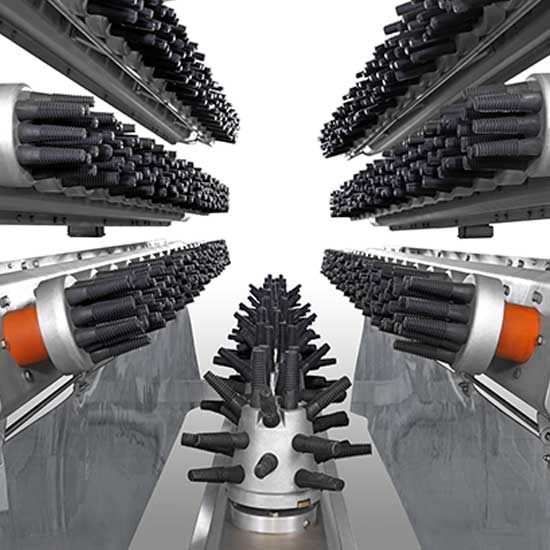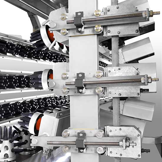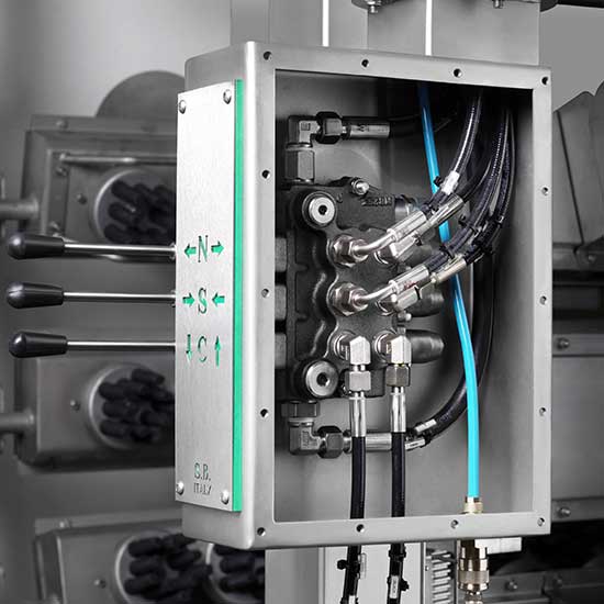 Apertura e chiusura dei 2 lati (petto e schiena) sono completamente indipendenti e con comandi idraulici. Tutte le regolazioni dedicate singolarmente ad ogni barra laterale, (profondità, angolo ed altezza) sono facilmente accessibili ed azionabili con avvitatore pneumatico. I piattelli portadita, sono montati su supporti studiati appositamente per raggiungere le ultime piume rimanenti. Tutte queste caratteristiche rendono le Rifinitrici S.B. Impianti le più versatili sul mercato mondiale.